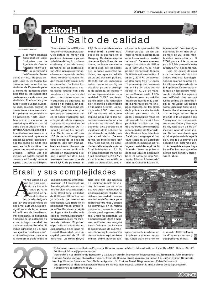 Editorial «Un Salto de calidad» Editorial «Un Salto de calidad»1012 DescargasDiario 20once, Paysandú, 20 de abril 2012. ¡Descarga ahora! Navegación de entradasAnterior: «Nuestros medios tienen fortalezas y debilidades en cómo tratan los temas de niñez y adolescencia»Siguiente: «Especialista indica que en Uruguay los niños «son pocos», los «tratamos mal» y son «los más pobres y criminalizados»